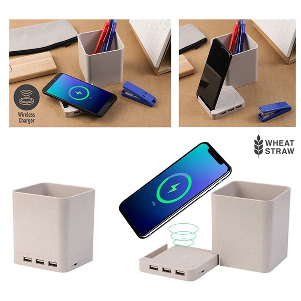 אינדו - מטען אלחוטי ומפצל USB בכוס לעטים
